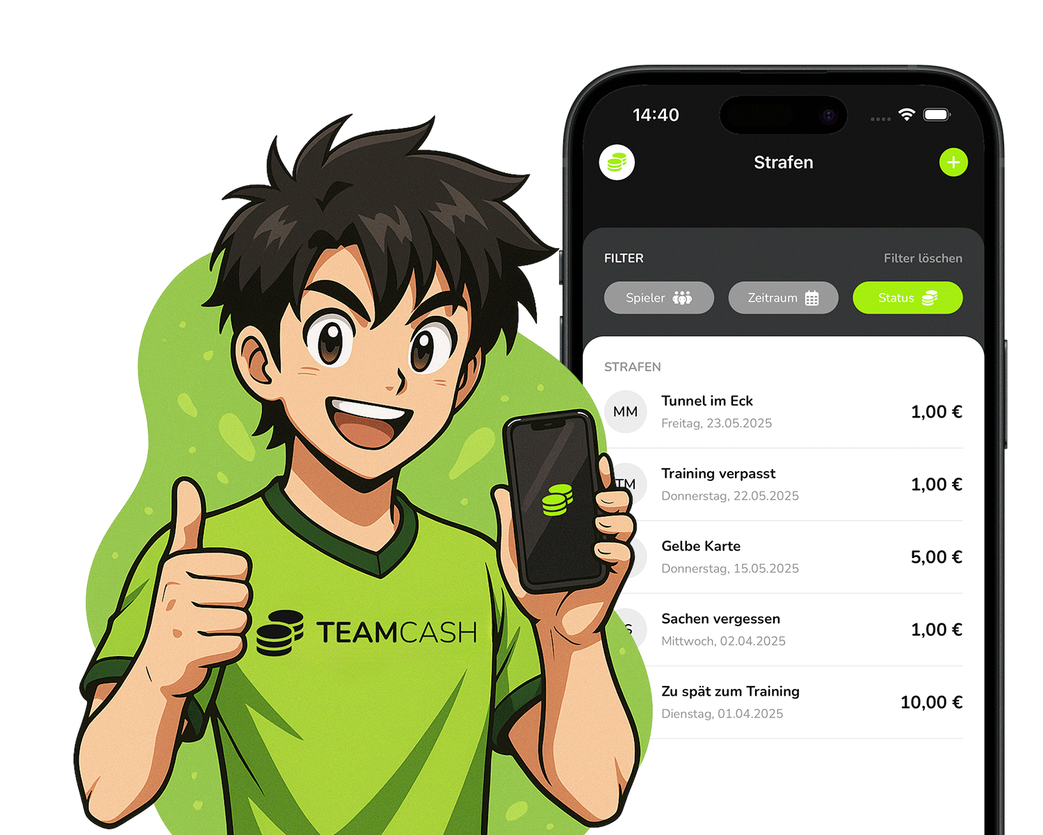 Strafenkatalog, Einnahmen, Ausgaben, offene Beträge: wer eine Mannschaftskasse führt, weiß, wie schnell der Überblick verloren geht. Mit TeamCash, der intuitiven Mannschaftskasse App, wird die Verwaltung zum Kinderspiel. Alles an einem Ort, immer griffbereit und so einfach wie nie.
